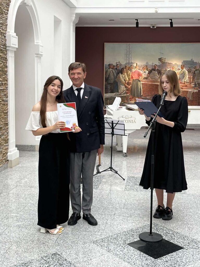 13 сентября учащаяся 436 группы Асмоловская Анастасия приняла участие в торжественном открытии выставки конкурса изобразительного искусcтва “Образ Родины любимой”. Ее работа была