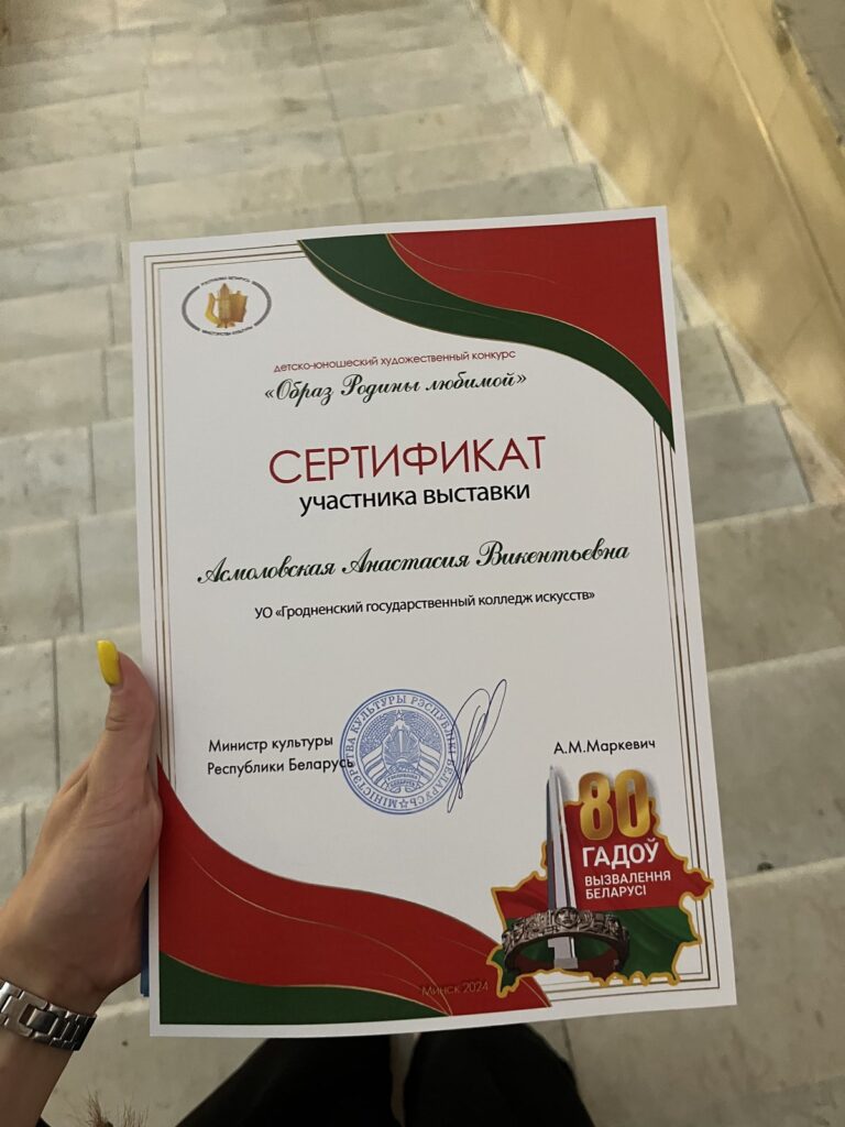13 сентября учащаяся 436 группы Асмоловская Анастасия приняла участие в торжественном открытии выставки конкурса изобразительного искусcтва “Образ Родины любимой”. Ее работа была представлена в Национальном художественном музее Республики Беларусь в г.Минск.