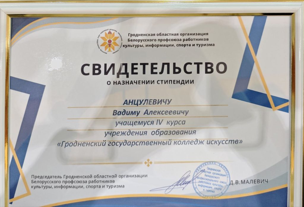 Именная стипендия Гродненского обкома профсоюза работников культуры, информации, спорта и туризма вручена учащемуся Гродненского государственного колледжа искусств — Анцулевичу Вадиму! 👏