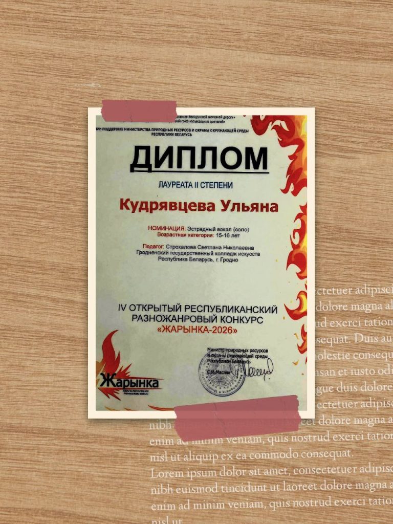 24 января в Минске состоялся IV Открытый Республиканский разножанровый конкурс «Жарынка 2026». В этом ярком событии Кудрявцева Ульяна, учащаяся второго курса 451 группы, специальности эстрадное пение УО “Гродненский государственный колледж искусств”, блестяще проявила свой талант и стала Лауреатом II степени.