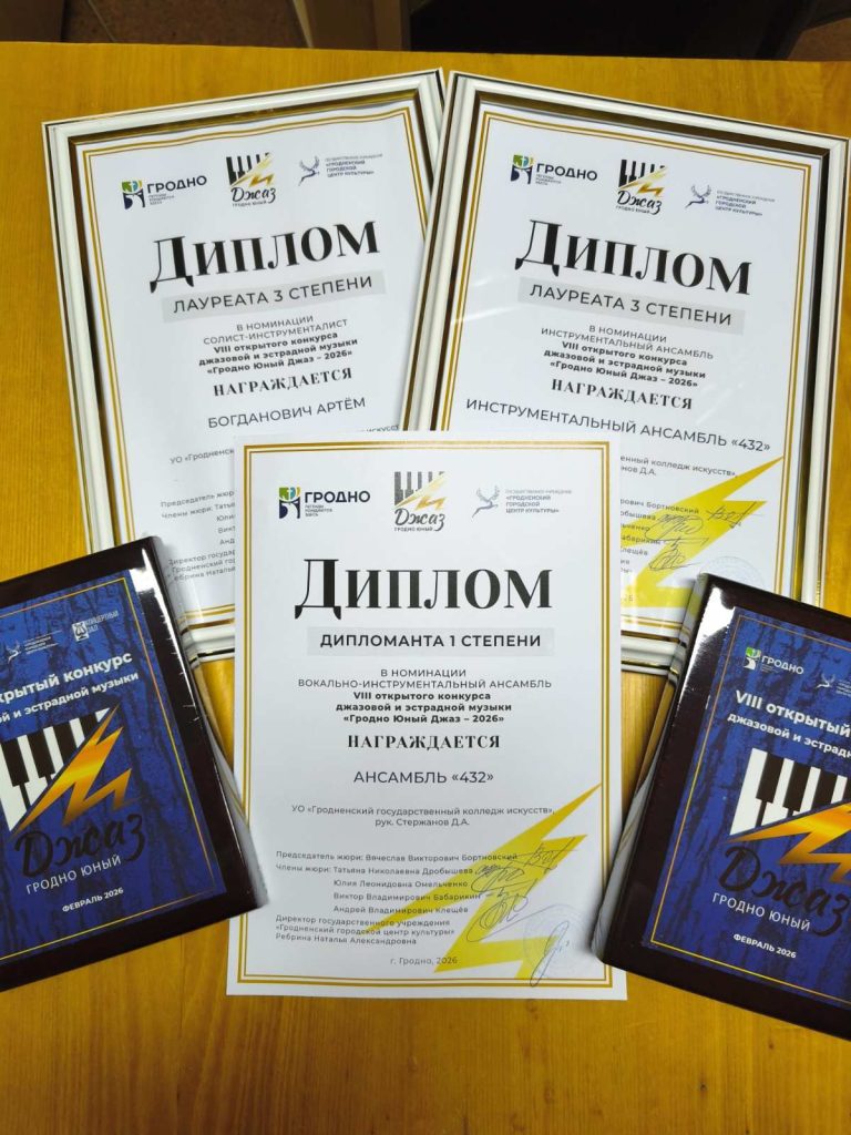 УО «Гродненский государственный колледж искусств» с гордостью поздравляет учащуюся 431 группы Анну Ковальчук, которая стала обладательницей звания «Дипломант 1 степени» на конкурсе «Гродно Юный Джаз 2026»!