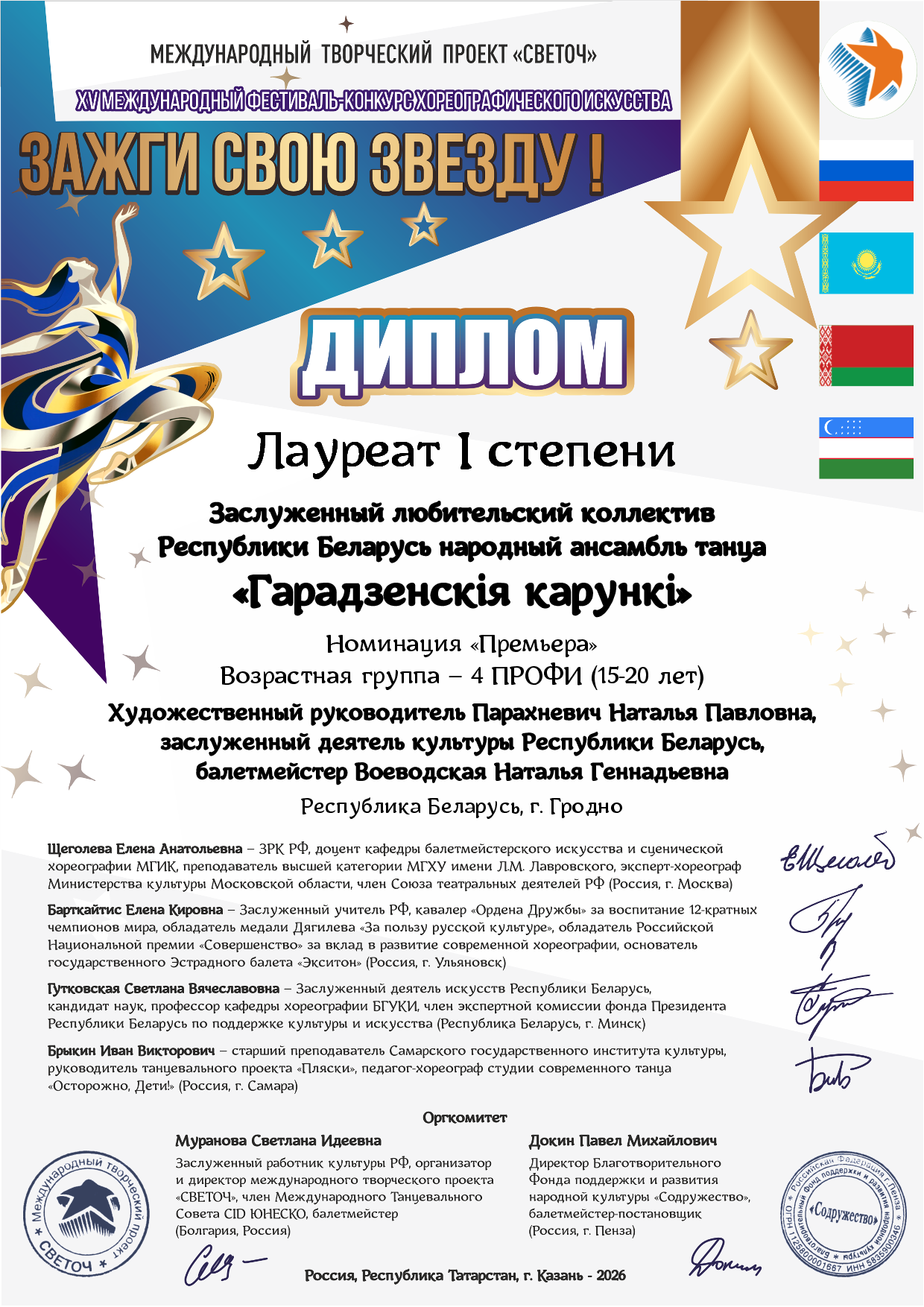 Поздравляем!!!Заслуженный любительский коллектив Республики Беларусь, народный ансамбль танца “Гарадзенскія карункі” – Лауреата I степени XV Международного фестиваля-конкурса хореографического искусства «ЗАЖГИ СВОЮ