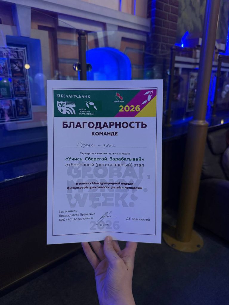Ковальчук Александры (ДО I – 457), Янюк Ксении (ДО I – 457), Самойловича Матвея (ДО I – 457), Щербацевич Марии (ХН I – 458), Золотковской Амелии (ХН I – 458), Пашкевич Марии (ХН I – 458) – приняли участие региональном турнире по финансовой грамотности для молодежи «Учись. Сберегай. Зарабатывай!».