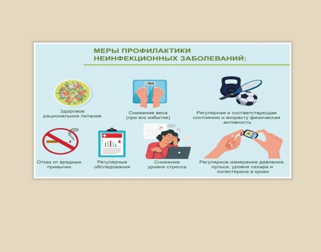 Основными общими мерами профилактики неинфекционных заболеваний являются: здоровое рациональное питание, контроль веса, соответствующая состоянию и возрасту регулярная физическая активность, отказ от вредных привычек, снижение уровня стресса и регулярные медицинские обследования