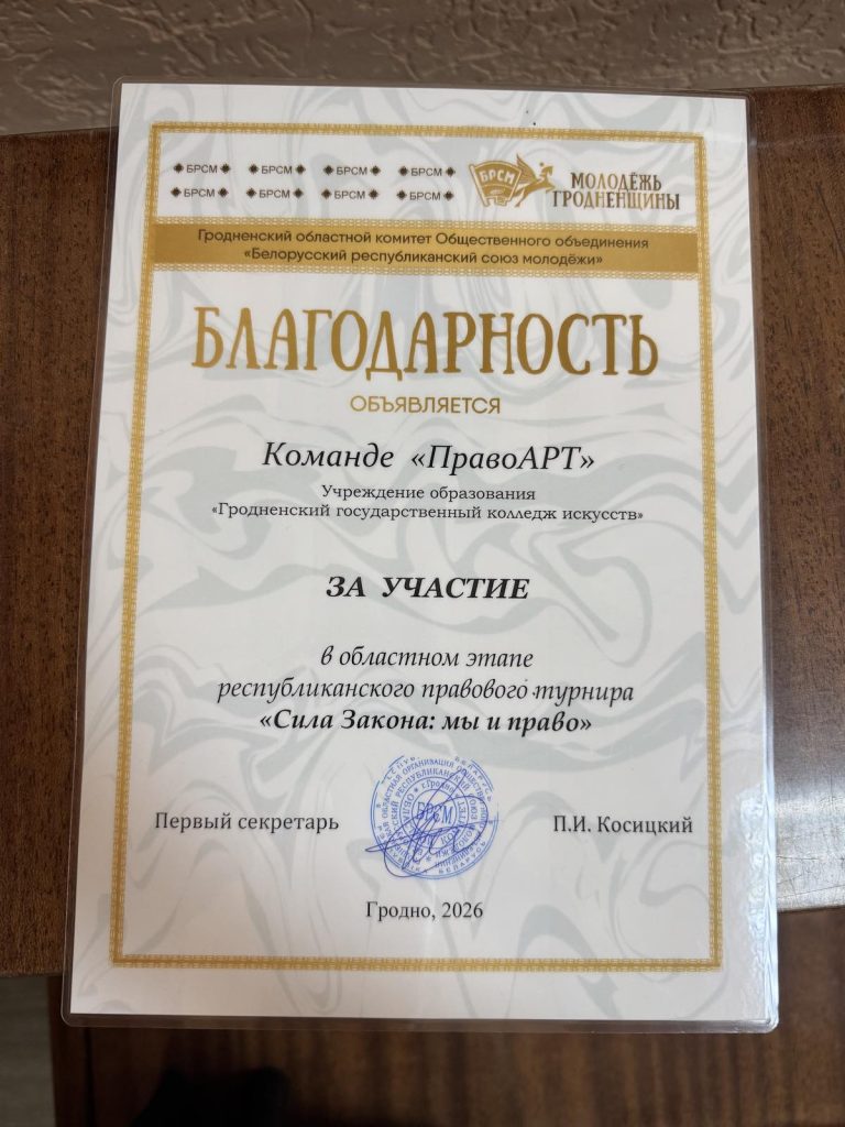 15 апреля сборная команда учащихся учреждения образования “Гродненский государственный колледж искусств”, члены молодежного отряда охраны правопорядка в составе Анцулевича В., Завистович А., Кречко А., Калач И., Антиповой Е. приняли участие в областном этапе республиканского правового турнира “Сила Закона: мы и право”, который состоялся в Молодежном центре “Гродно”.