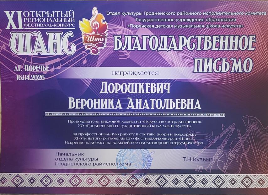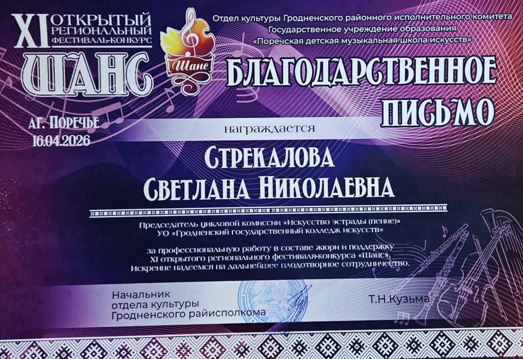 16 апреля председатель ЦК ” Искусство эстрады (пение)” Стрекалова Светлана Николаевна и преподаватель Дорошкевич Вероника Анатольевна отмечены Благодарственными письмами Отдела культуры Гродненского районного исполнительного комитета За профессиональную работу в составе жюри и поддержку XI открытого регионального фестиваля-конкурса “Шанс” (аг.Поречье)