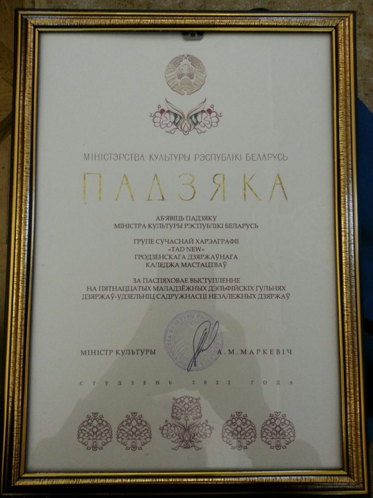 — I открытый республиканский конкурс-фестиваль искусств “Адчыняй.бай”: солисты группы современной хореографии “TAD NEW”: Гурина Н. (413 группа, преподаватели Клеменкова К.О. и Куракулов Д.С.) — лауреат II степени, Асинская М. (433б группа, преподаватель Куракулов Д.С) — лауреат I степени, Борисевич Д. (444 группа, преподаватель Куракулов Д.С.) — лауреат I степени (октябрь, 2023г.)​.